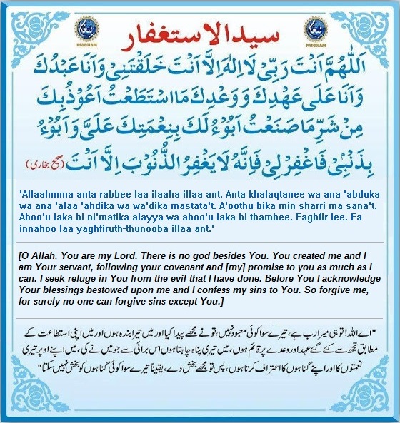 Shaddad bin Aus (May Allah be pleased with him) said: The Prophet (ﷺ) said, "The best supplication for seeking forgiveness (Syed-ul- Istighfar) is to say: 'Allahumma Anta Rabbi, la ilaha illa Anta, khalaqtani wa ana 'abduka, wa ana 'ala 'ahdika wa wa'dika mastata'tu, a'udhu bika min sharri ma sana'tu, abu'u laka bini'matika 'alayya, wa abu'u bidhanbi faghfir li, fa innahu la yaghfirudh-dhunuba illa Anta. (O Allah! You are my Rubb. There is no true god except You. You have created me, and I am Your slave, and I hold to Your Covenant as far as I can. I seek refuge in You from the evil of what I have done. I acknowledge the favours that You have bestowed upon me, and I confess my sins. Pardon me, for none but You has the power to pardon).' He who supplicates in these terms during the day with firm belief in it and dies on the same day (before the evening), he will be one of the dwellers of Jannah; and if anyone supplicates in these terms during the night with firm belief in it and dies before the morning, he will be one of the dwellers of Jannah." [Al-Bukhari]. [Riyad as-Salihin 1875]