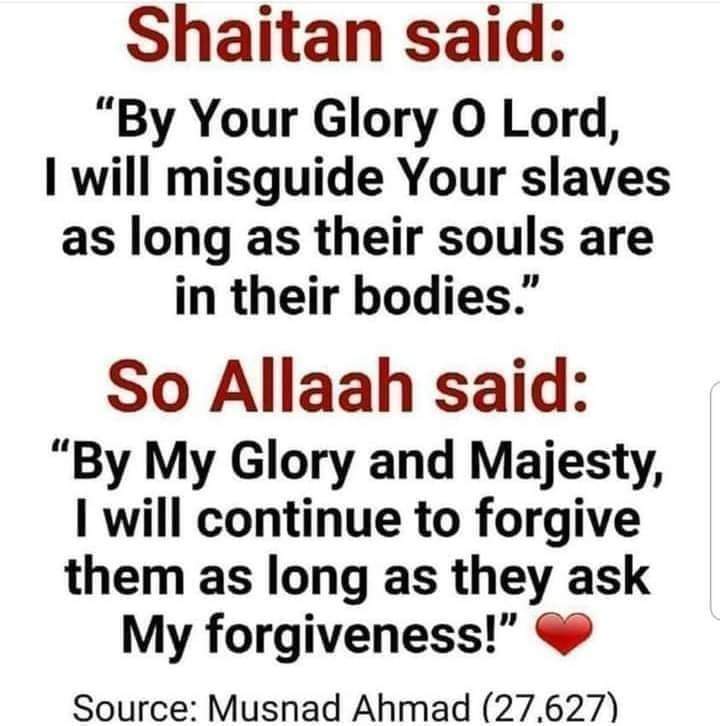 Abu Sa’id al-Khudri reported: The Messenger of Allah, peace and blessings be upon him, said, “Satan said: By Your might, O Lord, I will continue to mislead the children of Adam, as long as their souls are in their bodies. The Lord said: By My might and majesty, I will continue to forgive them, as long as they seek My forgiveness.”